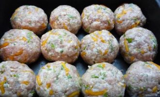 Формируем небольшие биточки, укладываем их в форму для запекания и отправляем в заранее разогретую духовку. Запекаем биточки при температуре 180°С 30 минут.