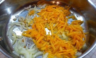 Готовим соус. В сковороде растапливаем 2 ст. л. смальца, добавляем нарезанный полукольцами лук и зажариваем его до золотистого цвета. Когда лук зарумянится, добавляем натертую на крупной терке тыкву и обжариваем овощи до мягкости.