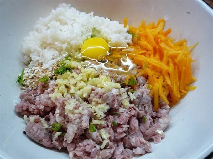 В фарш добавляем мелко рубленную зелень, отваренный до полуготовности рис, яйцо, чеснок, овсяные хлопья, натертую на крупной терке тыкву. Солим, перчим.