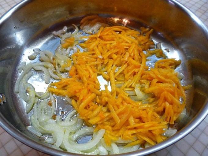 Готовим соус. В сковороде растапливаем 2 ст. л. смальца, добавляем нарезанный полукольцами лук и зажариваем его до золотистого цвета. Когда лук зарумянится, добавляем натертую на крупной терке тыкву и обжариваем овощи до мягкости.