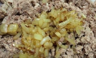Мелко порезанный лук спассеруйте на растительном масле до золотистого цвета, добавьте к мясу.