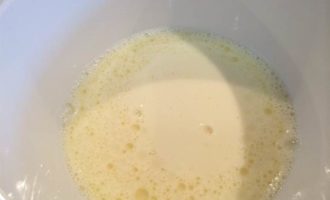 Взбейте вилкой куриное яйцо с сахаром и солью. Добавьте 1/2 стакана теплого молока, 1 ст. ложку растительного масла, перемешайте.