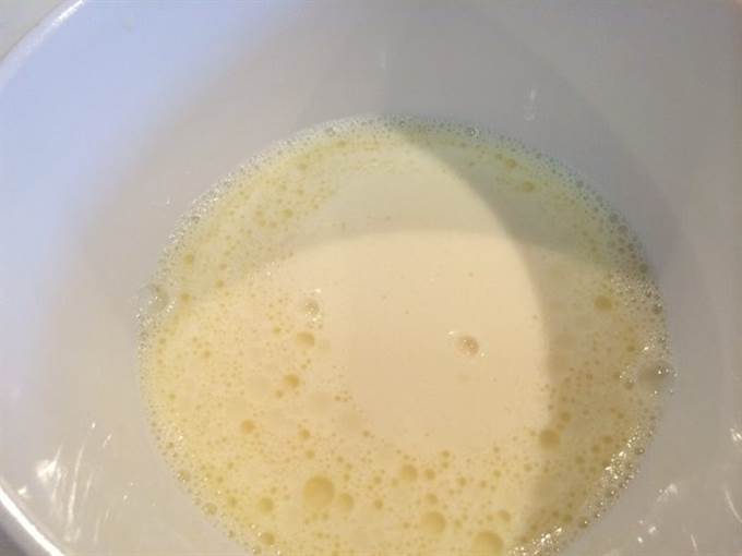 Взбейте вилкой куриное яйцо с сахаром и солью. Добавьте 1/2 стакана теплого молока, 1 ст. ложку растительного масла, перемешайте.