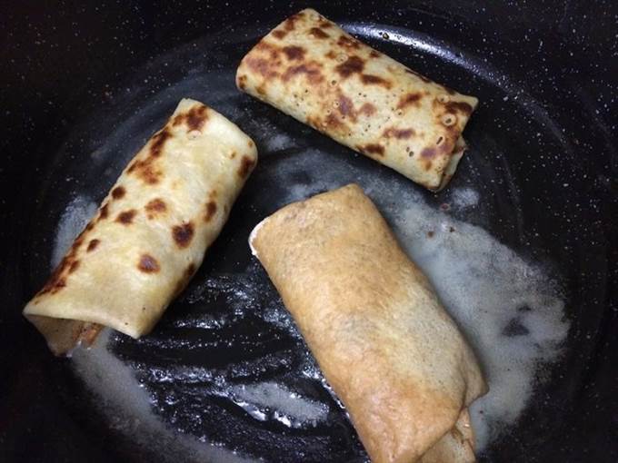 Обжарьте блинчики с мясом с обеих сторон на сливочном масле по 2 минуты.