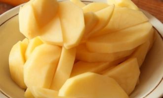 Картофель чистим и нарезаем так как вам нравится, но лучше не мелко. Тоже отправляем в кастрюлю. Добавляем воду снова так, чтобы все было слегка покрыто. Готовим под крышкой 30 минут.