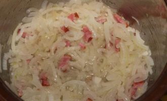 Берем глубокую и вместительную кастрюлю, желательно с толстым дном. У меня кастрюля емкостью 5 литров. Сало нарезаем и отправляем в кастрюлю, как только сало прожарилось, добавляем нарезанный полукольцами лук и тушим под крышкой по прозрачности.