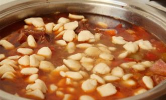 Пока готовится мясо, приготовим чипетки. Чипетки, это просто маленькие галушки, которые отщипываются от куска теста, немного подсушиваются, пока готовится гуляш, а потом отправляются туда же. Итак, с 1 яйца и муки замешиваем тесто. Если нужно — добавьте немного воды. А если совсем не хочется возиться с тестом — просто возьмите подходящие макарошки…
