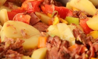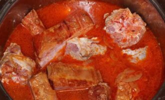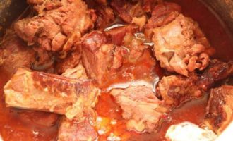 Добавляем воду так, чтобы мясо было покрыто практически полностью и доводим до кипения на сильном огне, затем делаем самый маленький огонь какой вы можете сделать и забываем про кастрюльку на 2, 5 часа. Правда, периодически нужно все-таки заглядывать в кастрюльку и помешивать…