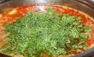 Нарезаем много, очень много зелени и добавляем в гуляш.