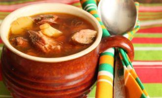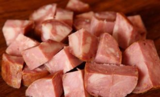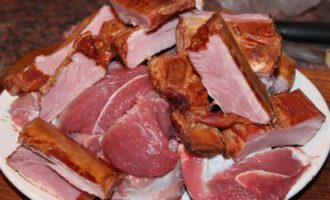 Мясо говядины, телятины и свиные ребра (копченые) нарезаем кусками. Мясо где-то по три на три сантиметра, ребра — как позволят косточки.