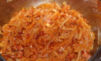 Как только лук стал полупрозрачным, добавляем хорошую столовую ложку с горкой паприки, перемешивая, проготавливаем около минутки.