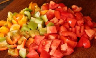 Перец сладкий (красный — не принципиально) и помидоры нарезаем кубиком.