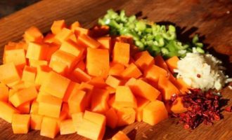 Морковь нарезаем кубиком, горький перец и чеснок рубим и отправляем к мясу. Добавляем лепестки перца чили или просто сушеный красный острый перец, тимьян.