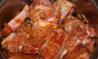 Через 2.5 часа у меня получилось вот такое мясо. Косточки я все вынула и отдала на радость собачкам. За это время мясо очень хорошо распарилось и сготовилось. Это уже вкусно, но мы пойдем дальше.