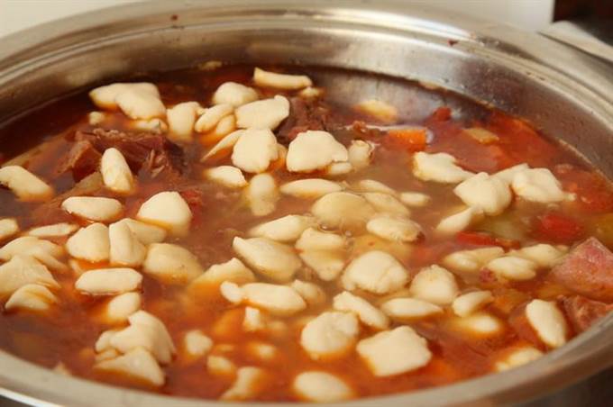 Пока готовится мясо, приготовим чипетки. Чипетки, это просто маленькие галушки, которые отщипываются от куска теста, немного подсушиваются, пока готовится гуляш, а потом отправляются туда же. Итак, с 1 яйца и муки замешиваем тесто. Если нужно — добавьте немного воды. А если совсем не хочется возиться с тестом — просто возьмите подходящие макарошки…
