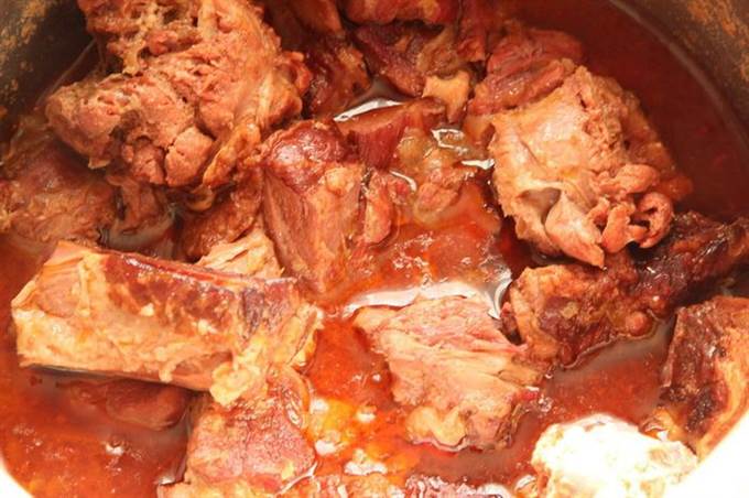 Через 2.5 часа у меня получилось вот такое мясо. Косточки я все вынула и отдала на радость собачкам. За это время мясо очень хорошо распарилось и сготовилось. Это уже вкусно, но мы пойдем дальше.