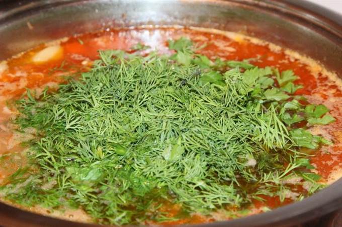 Нарезаем много, очень много зелени и добавляем в гуляш.
