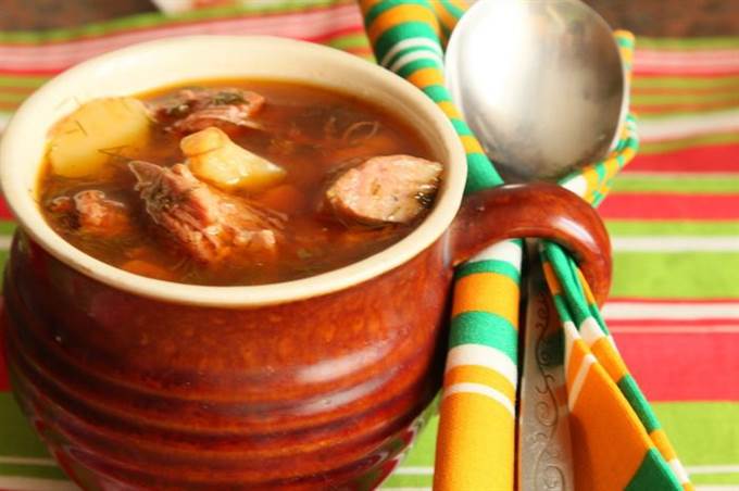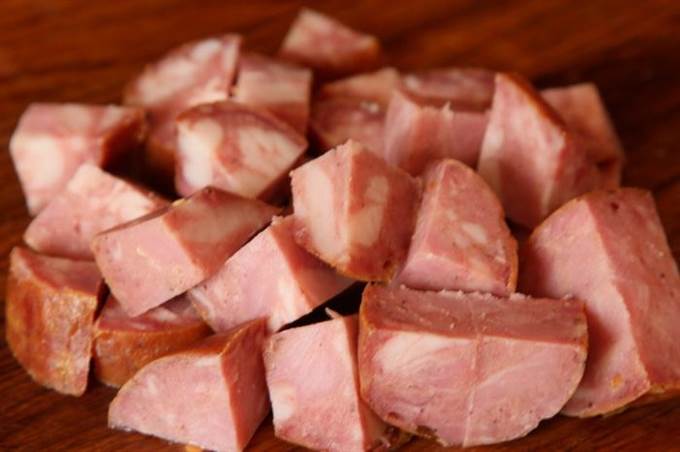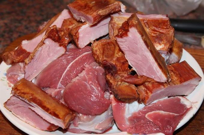 Мясо говядины, телятины и свиные ребра (копченые) нарезаем кусками. Мясо где-то по три на три сантиметра, ребра — как позволят косточки.