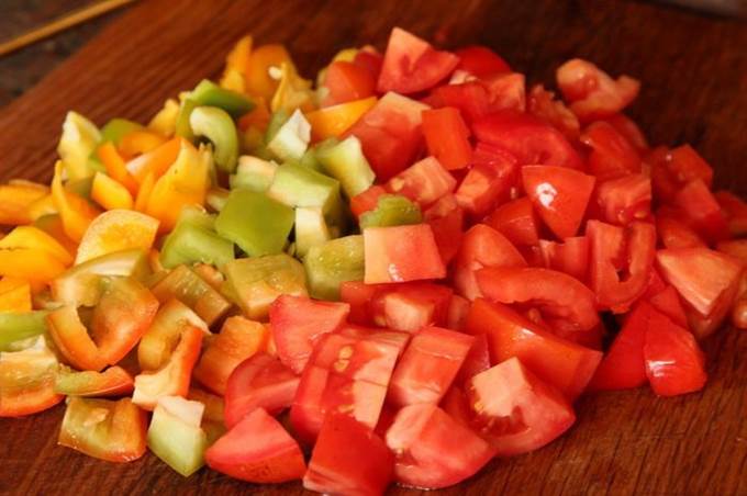Перец сладкий (красный — не принципиально) и помидоры нарезаем кубиком.