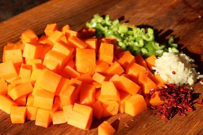 Морковь нарезаем кубиком, горький перец и чеснок рубим и отправляем к мясу. Добавляем лепестки перца чили или просто сушеный красный острый перец, тимьян.