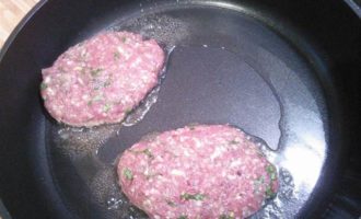 • Сформируйте из фарша овальные, плоские котлеты (у меня довольно крупные, по одной на порцию) и обжарьте на масле с обеих сторон.