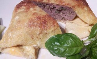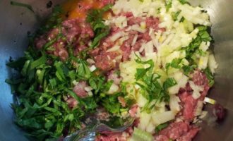 • Мясо (мясной микс на ваш вкус, у меня говядина со свининой, можно заменить на фарш) порубите очень мелко, добавьте яйцо, зелень (тоже любую, у меня любисток), соль, перец и соду. Тщательно вымесите фарш. Я «кидаюсь» фаршем.