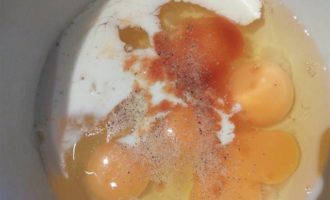 • Яйца взболтайте с молоком /сливками/водой, посолите, поперчите, добавьте табаско. Таким образом мы получили лизьен.