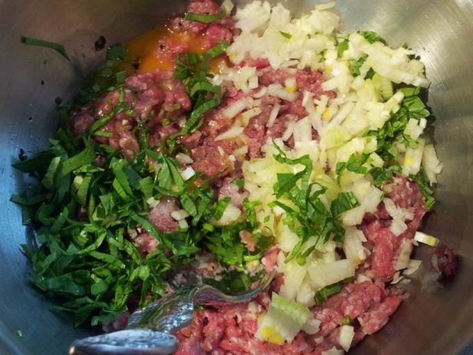 • Мясо (мясной микс на ваш вкус, у меня говядина со свининой, можно заменить на фарш) порубите очень мелко, добавьте яйцо, зелень (тоже любую, у меня любисток), соль, перец и соду. Тщательно вымесите фарш. Я «кидаюсь» фаршем.