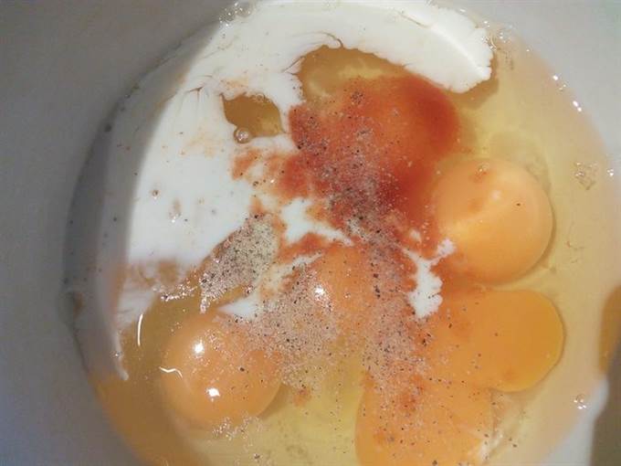 • Яйца взболтайте с молоком /сливками/водой, посолите, поперчите, добавьте табаско. Таким образом мы получили лизьен.