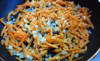 Лук мелко нарезать, обжарить на растительном масле до прозрачности, добавить морковь, натертую на крупной терке. Слегка обжарить овощи.