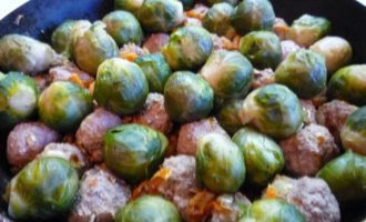 Капусту вынуть из воды и выложить ее в сковороду с овощами и фрикадельками. Все перемешать и жарить еще 5-10 минут до готовности.