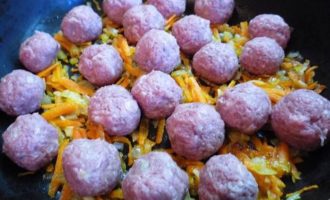 Лук и морковь перемешать, положить сверху фрикадельки и жарить в течении 20 минут, периодически помешивая.