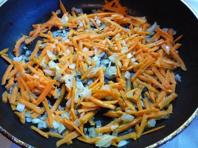 Лук мелко нарезать, обжарить на растительном масле до прозрачности, добавить морковь, натертую на крупной терке. Слегка обжарить овощи.