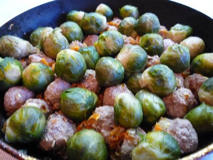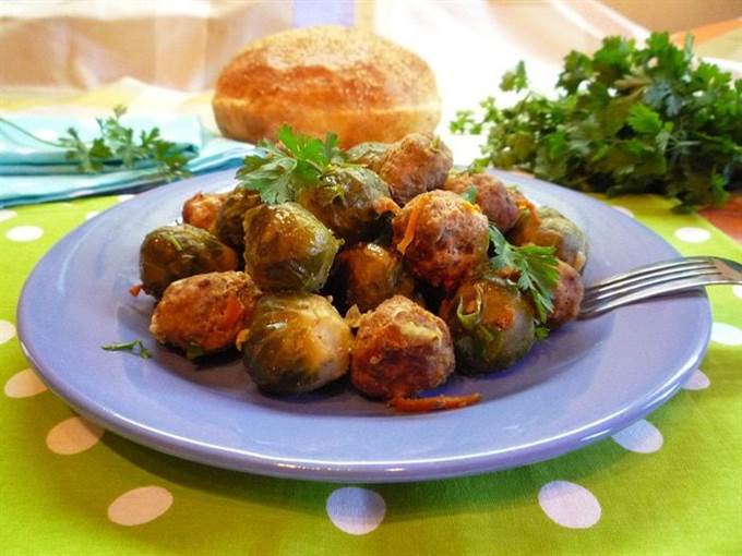 Подавайте брюссельскую капусту с фрикадельками с соевым соусом, сметаной и свежей зеленью!