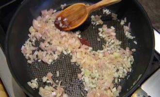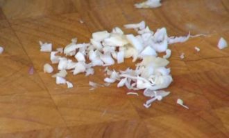 Чеснок вместе с нежной кожурой мелко порубить, добавить к луку и все немного обжарить.