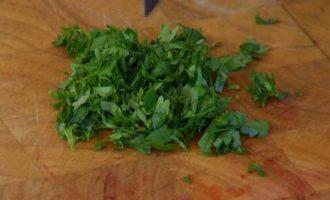 Кинзу мелко порубить.