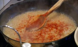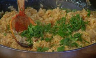 Готовый рис посыпать сладкой паприкой и куркумой, все перемешать и снять с огня.