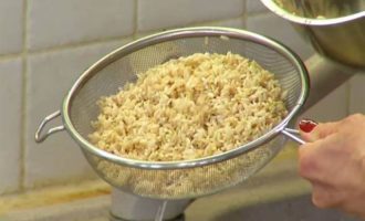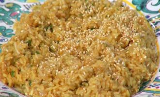 Перед подачей посыпать рис подсушенным кунжутом.