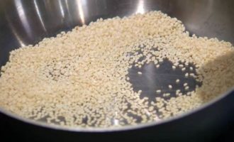 Кунжут всыпать в разогретую сковороду без масла, слегка посолить и обжарить до золотистого цвета.