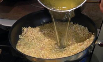 Рис всыпать в сковороду с луком и чесноком, перемешать и дать ему пропитаться маслом, влить пару половников куриного бульона, все перемешать, затем влить еще куриного бульона, так чтобы рис был полностью покрыт, и прогревать на небольшом огне до готовности.