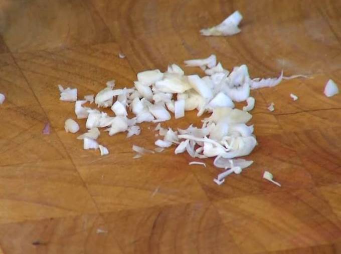 Чеснок вместе с нежной кожурой мелко порубить, добавить к луку и все немного обжарить.