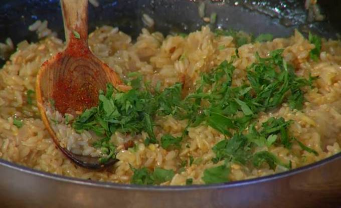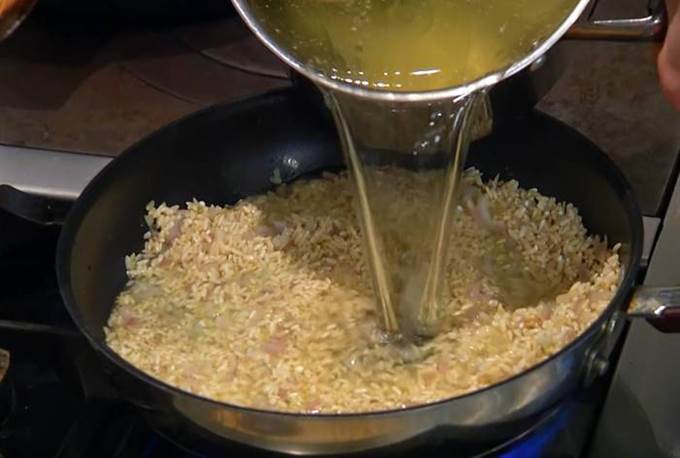 Рис всыпать в сковороду с луком и чесноком, перемешать и дать ему пропитаться маслом, влить пару половников куриного бульона, все перемешать, затем влить еще куриного бульона, так чтобы рис был полностью покрыт, и прогревать на небольшом огне до готовности.