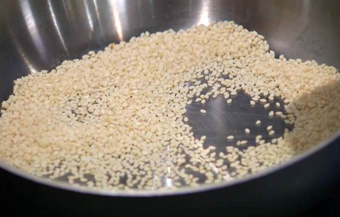 Кунжут всыпать в разогретую сковороду без масла, слегка посолить и обжарить до золотистого цвета.