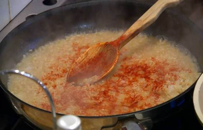 Готовый рис посыпать сладкой паприкой и куркумой, все перемешать и снять с огня.