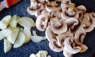 Чеснок нарезать тонкими пластинами, небольшую луковицу нарезать тонкими полукольцами. Шампиньоны нарезать тонкими пластинами. -