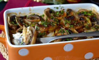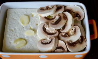 В формочку (лучше керамическую) кладем сыр Фета. За неимением можно заменить на не очень соленую брынзу. На сыр выложить чеснок, лук и грибы.
