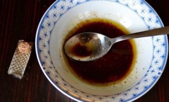 Отдельно в мисочке приготовить соус. Для этого смешать оливковое масло, бальзамический уксус, мёд, соль, свежемолотый перец и мускатный орех. Перемешать.