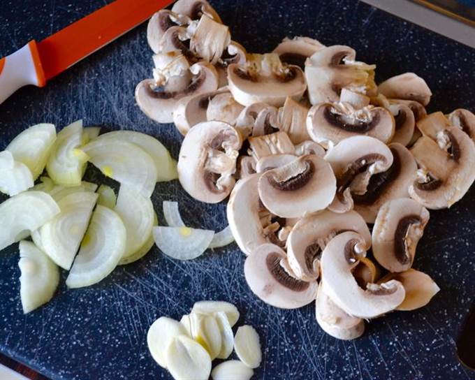 Чеснок нарезать тонкими пластинами, небольшую луковицу нарезать тонкими полукольцами. Шампиньоны нарезать тонкими пластинами. -