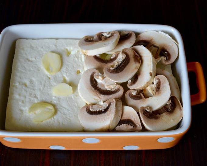 В формочку (лучше керамическую) кладем сыр Фета. За неимением можно заменить на не очень соленую брынзу. На сыр выложить чеснок, лук и грибы.