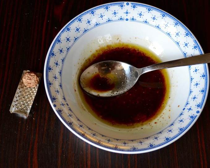 Отдельно в мисочке приготовить соус. Для этого смешать оливковое масло, бальзамический уксус, мёд, соль, свежемолотый перец и мускатный орех. Перемешать.